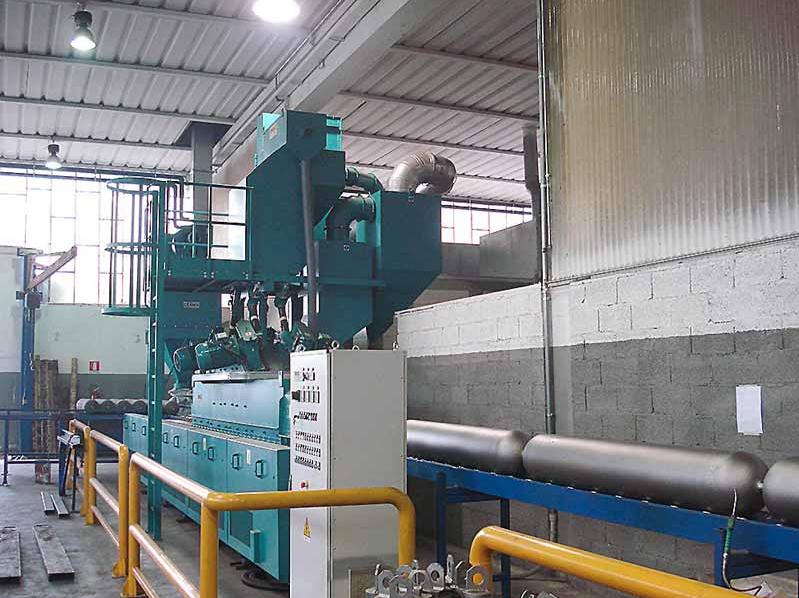 四川成都钢瓶外壁抛丸机采用螺旋转盘式辊道输送机制,将钢管螺旋输送到抛丸区 域进行抛丸处理,通过钢管的旋转,达到全面 的抛丸覆盖。减少了对工件的碰撞、损伤现象 ,降低了机器的噪声; 该机采用Q034型悬臂离心式抛丸器,具有使用 寿命长、结构简单、故障率低等特点; 采用风选式分离器,具有良好的分离效果和较高的生产率,对提高叶片寿命有积极的作用; 采用布袋式除尘器,粉尘排放浓度低于国家的标准,改善了工人的劳动环境;